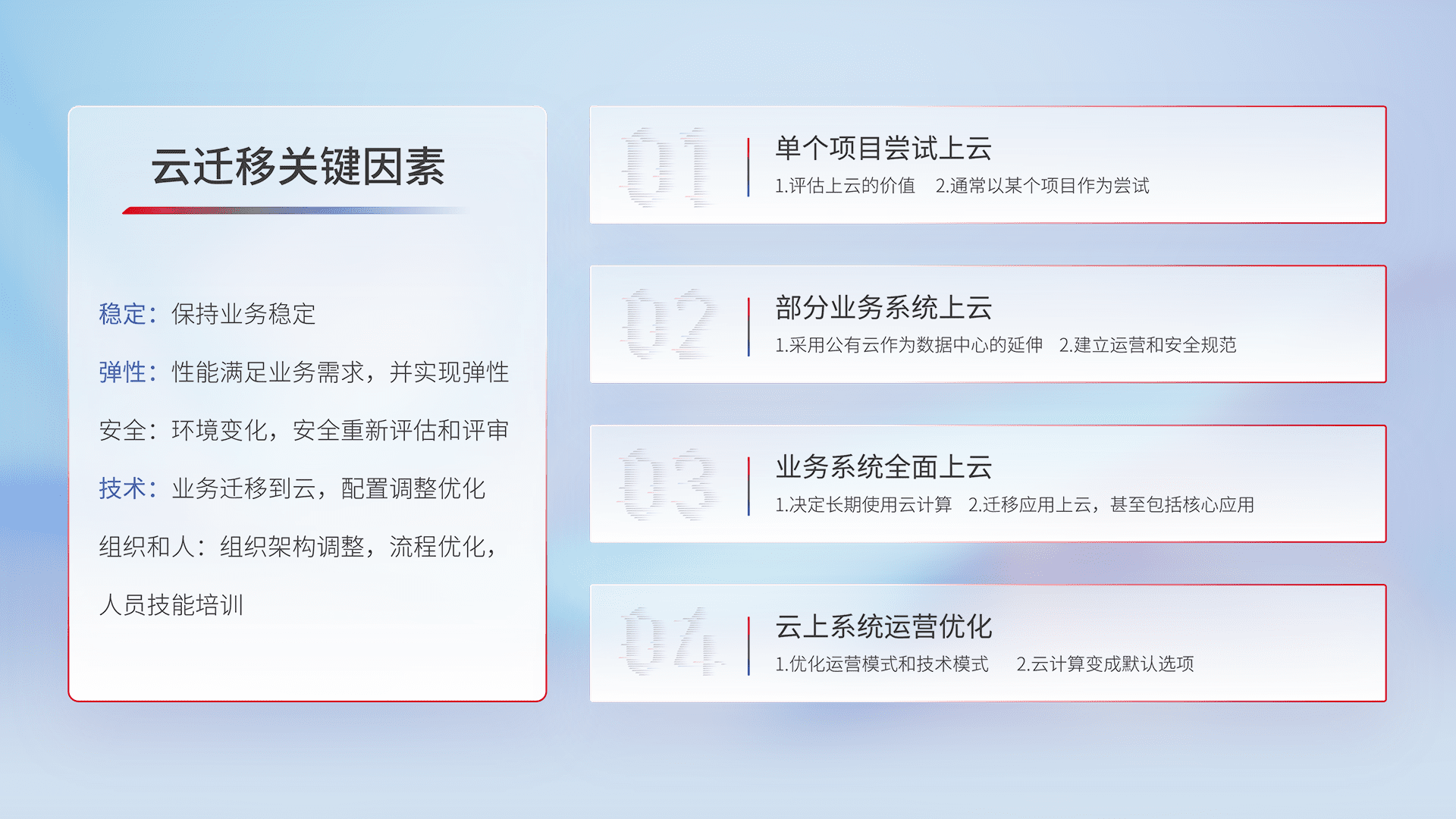 结合实际业务,,,从规划设计、、云平台选型、、、云原生改造、、、、数据迁移、、集成交付,,迁移全过程为客户识别最佳上云路径,,做好风险识别管理,,设计网络架构、、、、身份权限、、安全审计合规、、、操作审计、、日志审计、、、、监控告警策略、、、、多站点容灾设计等,,对云上基础设施进行整体规划,,提升IT治理水平,,以满足弹性、、、高可用、、、、高性能的需求。。。